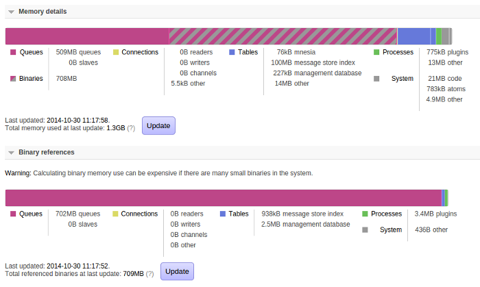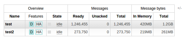 OK, but which queues are using all that memory? We can investigate that by looking at the details page for each queue (this information is of course also available via rabbitmqctl