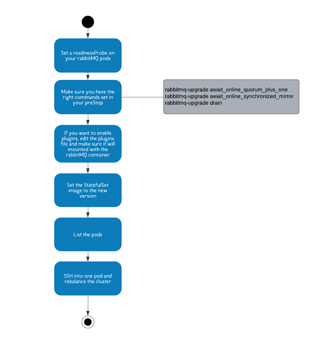 It is only a K8s operator that can automate such complex and delicate processes in such an elegant way and without a risk. Here’s an example of how RabbitMQ will save users from pain and errors by automating the process of in-place upgrade. The diagram lists the manual steps a user need to perform in order to have a rolling upgrade of the cluster (without an operator).
